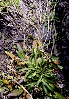 Herb with stout base, up to 1.8cm diameter, crowned by dense rosettes of hairless, fleshy leaves. Leaves up to 7cm long, deeply toothed. Flower head, up to 35cm tall, with simple or branched stems. Flowers white, 4-petalled, up to 8mm across. Seed pods narrow, 4cm or more long, 1.5-2mm wide, curved to straight. Seeds 1-1.5mm long.