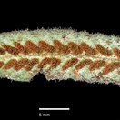Epiphytic (rarely terrestrial or rupestral) fern. Rhizome erect to short-creeping; paleae pale red-brown, lanceolate to narrowly lanceolate, acute to broadly acute, 1.5-4.3 × 0.4-1.2 mm. Stipe indistinct, winged almost to base; stipe hairs whitish to pale red-brown, abundant, 0.4-1.6 mm long. Lamina (23-)46-96(-139) × (3.5-)5.0-8.8(12) mm,linear-elliptic to oblanceolate, acute to obtuse,margins rarely somewhat crenulate; lamina hairs whitish to pale red-brown, common to abundant everywhere, 0.5-1.2 mm long in sori, usually somewhat shorter on margin (0.2-0.6 mm long); texture thinly coriaceous; veins visible or not, sometimes raised on upper or lower surface in dried material; midrib raised on lower surface, concolorous with or darker than lamina. Sori oblong, oblique, in middle part of frond, 8-22 pairs, 1.5-5.0 X 1.0-1.5 mm. Soral vein not or slightly prolonged beyond sorus; basiscopic vein approaching margin, soral vein rarely almost equalling basiscopic vein. Sporangia (150-)160.8-193.6(-240) microns long; indurated cells of annulus (9.0-)9.9-12.3(-14.0). Spores (20.0-)23.5-27.3(-33.0) micron diameter.