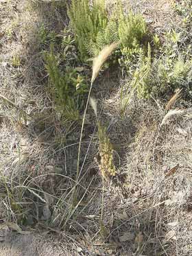 Light green to yellow-green, stout, tall tufted grass. Branching extravaginal. Leaves less than or equal to the erect to somewhat nodding narrow plumed culms. Leaf-sheath light brown, with minute, soft, appressed, retrorse hairs. Ligule 0.5-1.5 mm, membranous, undersides minutely scabrid, more or less truncate, minutely ciliate, occasionally asymmetric. Leaf-blade up to 400 x 1.5-5.0 mm, stiff, flat or slightly inrolled, gradually tapering, strongly ribbed, underside scabrid near apex, upper surface minutely scabrid on margins and ribs. Culm 0.3-1.2 m, internodes glabrous or minutely scaberulous below panicle. Panicle 100-250 mm, erect, spicate, light green to straw-yellow, often tinged with purple, densely branched, close-set, erect branches hidden by spikelets pulled together by entwining awns; rachis, branchlets and pedicels closely short-scabrid; spikelets, numerous, glossy. Glumes very narrow, linear-lanceolate, silvery; lower 4.5-9.0 mm, more or less equal to glume, shortly aristate, upper 5.5-10.0 mm long, equal to or greater than lemma, apex acuminate. Lemma 4.5-8.0 mm long, minutely scabrid, apex scarcely bifid; awn 20-30 mm, light green to purple, inserted 1.5-3.0 mm below lemma apex, column straight, awn more or less falcate and twisted about once. Palea 3-5 mm long, very narrow, keels minutely scabrid near ciliate apex. Callus hairs to 0.7 mm. Rachilla prolongation 0.1 mm long. Lodicules 0.5-0.7 mm long, membranous, elliptic, acute, apically ciliate. Anthers 1-3, 0.7-2.0 mm in opened flowers, 0.2-0.9 mm long in cleistogamous flowers. Seed 2.0-2.5 x 0.3-0.4 mm.