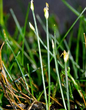 Emergent or aquatic diminutive, sedge forming bright green (when exposed) or dark green to brown-green tufts. Rhizomes 1-3 mm diameter (usually very slender), pale brown. Culms densely tufted, 10-120 mm long, setaceous, < 0.5 mm diameter, bright green (when exposed), dark green to brown green with yellowish transverse bars when submerged; sheaths membranous, more or less hyaline, red-veined, upper most sheaths colourless and inflated below the oblique orifice. Spikelet 2.5-3.0 x c.1 mm, (1-)5-flowered, ovate, sharply acute. Glumes 1.5-2.0 mm long, ovate, obtuse. Hypogynous bristles mostly absent, rarely 2-3 present. Stamens 3, Style 3-fid. Nut c. 1.0 x 0.5 mm, narrowly obovoid, obscurely trigonous, almost white, each face with 3-4 thick, vertical ribs joined by fine transverse bars; the persistent style very small, much constricted at the base.