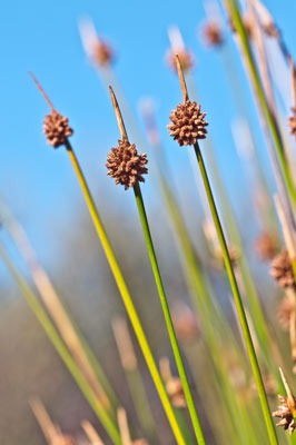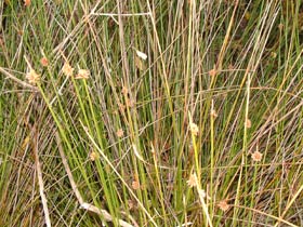 Rhizome short, 5-10 mm diameter, ascending to subhorizontal, woody, covered with red-brown bracts 5-10 mm long. Culms numerous, somewhat woody, 0.15-2.0 m, 1-2 mm diameter, yellow-green to bronze-green, densely packed on rhizome, rush-like, rigid and erect (sometimes in lush specimens with upper third curving over), terete or slightly compressed, finely striated when dry. Leaves reduced to 3-6 basal sheaths, the uppermost 50-130 mm long, brown or red-brown, the oblique orifice slightly dilated. Inflorescence an apparently lateral, solitary, hemispherical head, 7-15 mm wide, comprised of numerous, densely crowded, sessile spikelets; subtending bract continuous with the culm, rigid, erect, pungent, > inflorescence. Spikelets 3-4 mm long, ovoid, light brown. Glumes broadly ovate, obtuse, margins entire, more or less apiculate. reddish towards the tips, lateral nerves conspicuous. Hypogynous bristles 0. Stamens 3. Style-branches 3. Nut 1 mm long, < 1 mm wide, plano-convex to trigonous, apiculate, dark brown to almost black, shining.