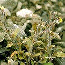 sparser, shorter, retrorse. Lateral branches ascending or erect (not rooting from nodes), few to many, up to 300 mm long, internodes usually equal to or greater than leaves. Upper stem-leaves sessile, spathulate to oblong, mostly 10-15 mm long, tip subacute; hairs on upper surface silky, ± appressed, overlapping, on undersurface sparser, shorter, irregularly arranged. Cymes mostly ebracteate, except sometimes towards base, mostly simple and terminal, either on primary laterals or on secondary laterals arising from axils of stem-leaves; internodes between fruits greater than calyx; pedicels very short. Calyx c. 4 mm long, lobes cut for greater than half calyx length, narrow, subacute; hairs long and straight towards tips, shorter and hooked towards base, with very short sparse hairs overall. Corolla white or yellow, tube equal to or greater in length of calyx, widest at top, lobes rounded, concave; filaments very short, fixed below scales, anther-tips barely reaching scales; style more or less equal to tube length in flower. Nutlet 1.4-2.1 × 0.8-1.0 mm, ovate to ovate-elliptic, black.