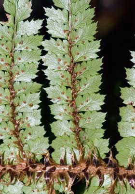 Polystichum: Many rows (of sori); from the Greek polus and stikhos; parallel rows of spore cases