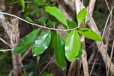 Small tree with leathery leaves that are paler underneath and with straight veins radiating from central vein more visible on the upper surface inhabiting coastal forest in the upper North Island. Twig fuzzy. Flowers tiny. Fruit 2.5-4cm long, red ripening to almost black, enclosing 2-4 hard narrow shiny seeds.