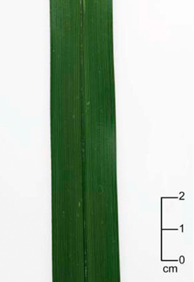 Upright, densely tussock-forming evergreen perennial herb; forming very tight, compact and upright clumps; rhizomes up to 20 mm long. Leaves 1-2 m long, 18-25 mm wide, uniformly olive-green to dull dark green, discolourous, usually upright, slightly curved, sometimes drooping, more or less flat, lamina smooth and more or less glossy; margin and abaxial midrib with obscure to prominent minute teeth; apex subacute to more or less obtuse, cucullate; leaf sheaths equitant, tightly clasping, surface and margin weakly to strongly flushed blood-red, red-maroon or pink, especially near base; apex subacute to more or less obtuse, cucullate. Inflorescence erect, 1-2 m long, usually among the leaves; scape slender, arching base asymmetric up to 8.5 x 5.3 mm diameter; panicle 400-700 mm long, branches spreading, short, regularly spaced; cauline leaves subtending branches, leaf-like at the base but reducing in size and becoming bract-like distally; cymules 3-5-flowered; pedicels 9-20 mm long, slightly recurved, terete; bracteoles 1,0-1.2 x c.0.2 mm, narrow-triangular, subtending pedicels, caducous. Flowers nodding, 10-11 mm diameter, opening mid-morning, collapsing late afternoon, perianth segments patent to slightly recurved; sepals 4.8-5.5 x 1.9-2.0 mm, oblong, undersides olive-green flushed red-brown, upper surface paler, apex obtuse; petals 4.1-4.2 x 2.9-3.0 mm, obovate, white, midvein olive-green, apex obtuse to retuse; filaments 6, 1.2-1.4 mm long, white; struma 0.8-1.3 x 0.6-0.7 mm, short oblong to oblong-obovate, yellow, minutely papillose; ovary 1.3-1.5 x c.1.3 mm, green, more or less globular; style 1.4-1.5 mm long, white. Berry 8-20 x 7-10 mm, ovoid to oblong, grey-white and dull to strong violet-blue and glossy, pericarp spongy. Seeds 1.8-2.5 x 2.3-3.2 mm, ovoid, black, shiny.