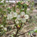 Low growing shrub bearing a few erect twigs to 50cm tall with spaced pairs of small rounded blue-green leaves inhabiting damp sand dunes near Himatangi. Twigs hairy. Leaves to 5.5mm long. Flowers usually present, white, body hairy, both male and female parts present, in clusters. Fruit white.