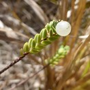 Small, sparingly branched shrublets up to 500 mm tall. Branches erect to suberect, whip-like, often devoid of leaves for basal 2/3 of stem. Root system small and weak. Young branchlets sparsely hairy in leaf axils and on receptacle, sometimes with well-defined narrow bands of short hair along the full length of the internode; older stems hairless, initially purple-black fading to grey-brown. Node buttresses smooth, brown, and occupy the whole internode or forming hairless strips, sometimes prominent on leafless stems. Internode length less than or equal to 3.0 mm. Leaves decussate, ascendant, becoming patent, persistent, on short (0.5–0.8 mm) red petioles; lamina glabrous, pale green to glaucous-green, .03–5.5 × 1.2–3.5 mm, elliptic to slightly obovate, slightly adaxially concave, obtuse, base cuneate to truncate. Stomata evident only on upper surface. Inflorescences terminal on branchlets, loose, 3–11-flowered. Involucral bracts 4, broad elliptic to ovate (6 × 3 mm) partly hiding the flowers. Plants bisexual. Flowers white, on short pedicels (0.8 mm); tube and calyx lobes moderately hairy outside, inside glabrous, or rarely with sparse hair near the mouth; tube to 3 mm long, ovary portion 1 mm long, calyx lobes 1.3 × 1.0 mm. Anther filaments inserted at mouth of tube, Anthers yellow. Ovary with a few hairs at summit. Fruits globose, fleshy, translucent white, 5.0 × 4.5 mm. The hypanthium shedding irregularly, near the base as the fruits ripen. Seeds narrow-pyriform, with very thin crest 2.8 × 1.7 mm