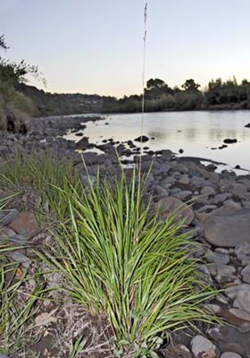 Tall, erect, strongly tufted, coarse, perennial grass. Leaves 100-600 x 3-12 mm, flat, mod ribbed, harsh, yellow-green, hairless except at leaf base, margins rough, glossy beneath. Leaf base stout, encircles stem with collar, hairy; sheath base occ brownish-purple; emerging leaf rolled. Ligule up to 2 mm long, membranous, firm, greenish. Seedhead an open panicle, 5-25 cm long; seeds large, clustered in coarse spikelets 10-20 mm long.