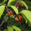 Deciduous small tree up to 8 m high. Leaves cherry-like, usually 60-130 by 20-60 mm, thin and on 12-20 mm petioles. Leaves rounded at base, broadly elliptic with sharp point at tip, small teeth along entire leaf margin. Deep red bell-shaped flowers in clusters of 2-3. Fruit up to 12 x 10 mm, glossy scarlet, glabrous.