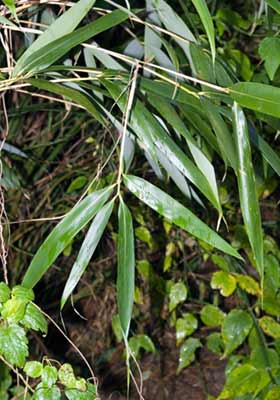Medium sized bamboo up to about 5 m, forming dense thickets with extensive rhizomes. Culm dark green, banded white just below nodes. Branches one per node, sometimes 2-3 at upper nodes, leaf sheath glabrous, often purplish above. Leaf blade 3.5 by 25 cm long, one on each branch. This species has flowered frequently in NZ, the inflorescence is purplish on the exposed side, spikelets 4-9 cm, flattened.