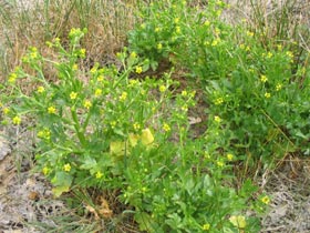 Fleshy, shiny-leaved buttercup, superficially looking like a young celery plant, but with small (0.5 to 1 cm diameter) 5-petalled pale yellow flowers and a cylindrical green fruit on a many branched flowerhead on the top of upright leafy stem (up to 60 cm tall).
