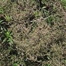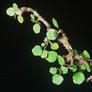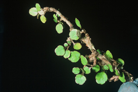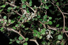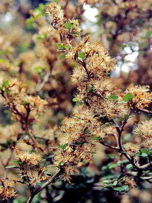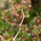 Bushy shrub with zig-zagging tangled branches bearing uneven-edge dark-green leaves that are white underneath inhabiting scattered open upland areas from the Central North Island to north Canterbury. Leaves 3.2-13.4mm long, about as wide as long, small teeth on edge may have a small purple blotch. Seeds fluffy, conspicuous.