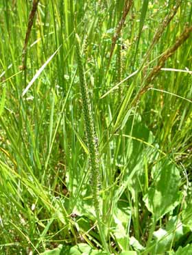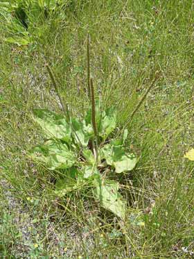 Sparsely hairy herb with lance-shaped leaves lying close to the ground arising from a central point (like a dandelion), up to 30 cm long and 8 cm wide, with parallel veins, flower in centre of leaves, an up to 60 cm tall stem with a cylindrical flowerhead more than 10 cm long at the top, consisting of many small brown flowers.