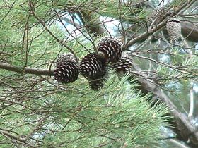 Medium to large tree (40-60 m in cultivation). Needles are slender, about 15 cm long, deep or dark green and held in bunches of 3. Male cones are clustered at ends of new shoots in spring, light-brown to pinkish. Female cones are 12 by 8 cm, brown, in clusters of up to 6 and backwards pointing.