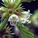 Perennial herb. Stem hairy, to c. 1 m tall. Lvs shortly petiolate or sessile. Lamina 3-8.5 × 1-3 cm, ovate-lanceolate to elliptic, deeply crenate-serrate, hairy at first, becoming glabrous or nearly so; basal area with narrow-oblong or linear-oblong lobes extending to midrib; apex ± acuminate. Upper lvs and bracts smaller, without basal lobes, hairy, especially on veins below. Calyx c. 3 mm long, hairy; teeth > tube, lanceolate-acuminate. Corolla 3.5-4 mm long, white with purple spots on lower lip and in throat. Nutlets 1.2-1.3 mm long, broad-obovoid, glandular and swollen on anterior face, with margin clearly delimited.