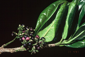 Sturdy, multi-trunked tree 5-8 x 4 m tall. Bark greyish, tessellated. Young branches and branchlets lenticellate. Petiole 25 mm long. Leaves subcoriaceous, glabrescent, 120-160 x 70 -100 mm, oblong to obovate, in exposed conditions distinctly recurved, otherwise flat, margins entire, apex obtuse, rounded, or slightly emarginate; base cuneate to obtuse; lateral veins of underside subtended by axillary hairy, pocket-domatium. Inflorescence usually ramiflorous or cauliflorous, rarely terminal, 80-120 x 40-120 mm. Male flowers unknown. Female flowers 1.5 x 1.5 mm, petals 2.6 mm, greenish white, stamen filaments in bud kinked sideways, straightening at anthesis, 1.5 mm long; anther 1-1.4 mm, pollen usually malformed and sterile. Ovary barrel shaped, 2.8 x 2 mm; stigmatic ring 1.5-1.8 mm diam., crested into 3 triangular plates. Fruit ellipsoidal, 10 x 4.5 mm, flesh purple; stone 9 x 3.5 mm.