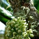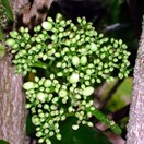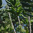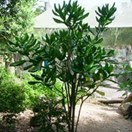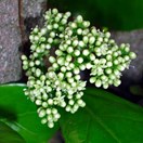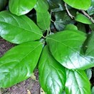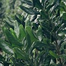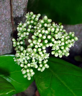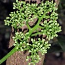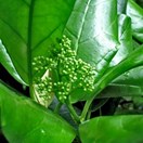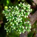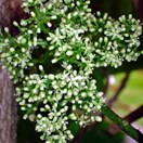 Rare multi-trunked small tree bearing very large broad glossy curled leaves inhabiting the three Kings Islands. Leaves 120-160mm long, widest towards tip. Flowers small, green, in clusters along branches. Fruit purple, 10mm long, containing a single seed.