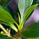 Large shrub or small tree with numerous branches from base, generally with dense bushy habit. Bark smooth. Leaf buds green and more or less viscid when fresh, often drying black. Petiole c. 1 cm long, scarcely distinct from attenuate base of lamina. Lamina 4-12 X 1.25-3 cm, elliptic or narrowly elliptic, thick and semi-succulent, finely dotted with pellucid glands, mostly serrulate in the upper 1/2, occasionally entire or, especially in juvenile leaves, more extensively serrulate or serrate; apex mostly acute. Fls 1-few; pedicels c. 5 mm long at anthesis. Calyx c. 3 mm long, lobed nearly to base; lobes lanceolate-acuminate. Carolla 7-8 mm diam.; lobes>tube, rounded, white with fine purple dots, white-bearded inside towards base. Style hairy. Drupe c. 6 mm diam., broad-oblong or broad-ovoid (almos as wide as long), shining deep purple. (Webb et al 1988).