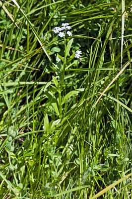 Low growing herb on wet ground and damp hollows. Leaves are pale green, stems often bend at the base and leaves are willow like. The flowers are small, pale blue with a yellow center.