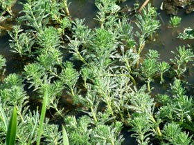 Sprawling emergent perennial herb with light grey-green foliage that is feathery in appearance (deeply divided). Submerged leaves are also finely divided and are often bright pink in colour.