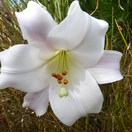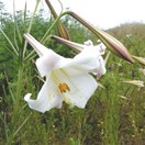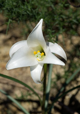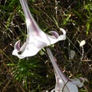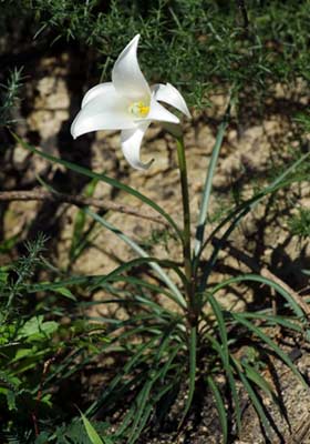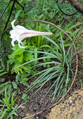 Perennial herb with simple stem to about 75 cm. Stems root freely at ground level. Many dark-green strap-like leaves to about 13 cm long. Large white trumpet-like flowers, often tinged purple on the outside.