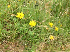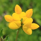 Scrambling herb, either forming dense yellow flowered patches or scrambling through other vegetation, leaves with 5 lobes, small ( c. 1 cm) yellow, pea-like flowers in groups of 12 or more at the branch tips.