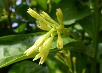 Shrub, generally 1.5-2.5 m high, almost glabrous. Petiole c. 1cm long. Lamina 5-15 X 1.5-6 cm, elliptic to elliptic-ovate, glabrous or with minute puberulence when young; base cuneate to rounded, sometimes asymetric; apex abruptly acuminate. Panicle open, large; fls usually shortly pedicellate, sometimes subsessile, fragrant nocturnally. Calyx 2-3 mm long; lobes >1 mm long, +/- triangular, densely ciliolate, acut. Carolla 1.5-2 cm long, pale green or greenish white; tube cylindric to narrow-funnelform, widening slightly above; lobes 3 mm long, eventually spreading, glabrous except for shortly villous margins. Fruit c. 0.5 - 1 cm diameter, globose to ellipsoid, white glossy. (Webb et al 1988).