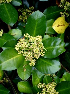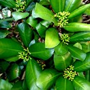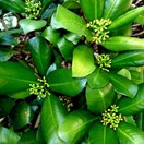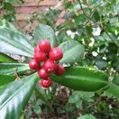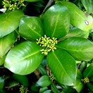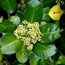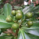 Small tree with dark green glossy leaves bearing conspicuous red round fruit inhabiting the Three Kings Islands. Leaves 10-18cm long, leathery, widest towards tip, small pale dots visible when held up against the light. Fruit around 17mm wide, in tight clusters.