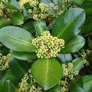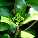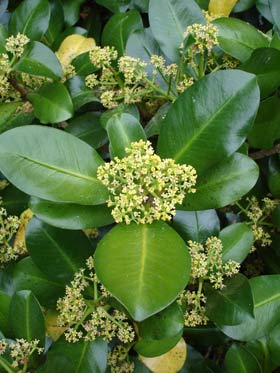 Stout, mostly dioecious tree up to 8 m tall (usually much less). Branches ascending, initially fleshy to sub-succulent, soon becoming woody. Bark grey, smooth (finely lenticellate). Leaves on stout, succulent, coriaceous petioles up to 10 mm long; lamina rigidly coriaceous, 100-200 x 40-190 mm, dark glossy green above, pale beneath, obovate to broadly obovate, margins entire, midrib conspicuous, side veins evident. Inflorescences terminal, paniculate up to 60 x 60 mm, enlarging in fruit; bracteate with bracts shedding as inflorescence matures. Flowers with valvate sepals. Male flowers yellow to yellowish -pink, 4-6-partite, corolla longer than sepals (3-6 x 1.0-1.5 mm), narrowly obovate to broadly oblong. Filaments longer than corolla; anthers elliptic, pollen yellow to yellow-orange. Female flowers pale yellow to pink bearing rudimentary or rarely functional stamens, corolla shorter than sepals, 2.5 x 1-1.5 mm, adnate, shortly oblong to tubular, dehiscing after flowering as a ring. Ovary ovoid, tapered into a stout style. Fruit a globose to subglobose, drupe up to 20 mm diameter, bright red with white flesh. Seed single, enclosed within a brittle subcoriaceous grey-brown to greyish-white endocarp.