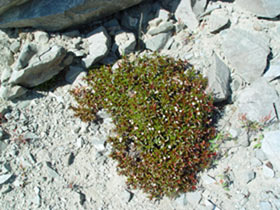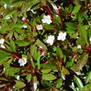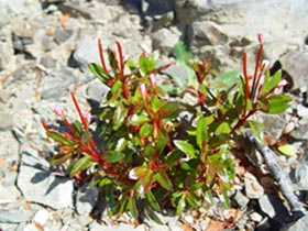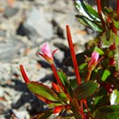 Basally woody, perennial hebr formign densely branched reddish-green bushes up to 400 x 400 mm; stems often glossy, glabrous, or with a few strigulose hairs at junction of petiole margins. Petiole 3-9 mm long. Leaves coriaceous, opposite with the uppermost alternate, 13-26 x 4-8 mm, reddish green to red, narrowly elliptic to elliptic, apex acute with a blunt, globose, persistent apiculus, base acute; lamina surfaces glossy, lateral veins not evident when fresh (2-3 each side of midrib seen when dry); margins remotely serrulate bearing 4-10 teeth. Flowers erect. Pedicels 1-3 mm long. Ovaries 9-11 mm, glabrous. Floral tube 0.8-1.2 x 1.2-2.0 mm. Sepals 4.2-5.4 x 1.0-1.7 mm, not keeled, glabrous. Petals 6.7-7.4 x 3.8-4.6 mm, white flushing pink after anthesis, notch 1.7-2.0 mm deep. Anthers 0.6-0.8 x 0.4-0.6 mm, yellow; filaments of longer stamens 2.5-4 mm long, those of shorter 1.0-2.6 mm. Style 2.4-4.0 mm long, white; stigma 1.7-2.0 x 0.6-1.2 mm, white, clavate. Capsule 2.0-3.8 mm long, glabrous; pedicel elongating up to 10 mm at fruiting. Seeds 1.3-1.6 x 0.4-0.6 mm, brown, obovoid, smooth; coma 4 mm long, detaching readily.