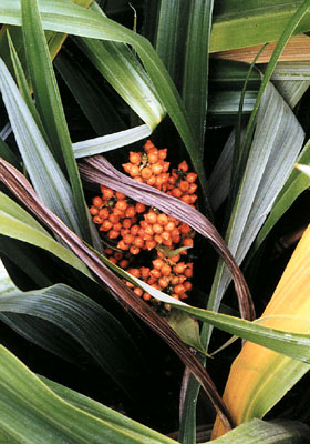 Kakaha has long flax-like leaves clad in silvery hairs. Male and female flowers are found on separate plants. The male flower stalk is very thick and bears dark green, scented flowers, while the female plant has pale, greenish-white flowers. Flowering occurs from October to December, while the orange or red fruit may be seen from February to July.