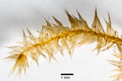 Plants robust, epiphytic, creeping, yellow-green to brown-yellow. Stems sparsely branched. Leaves spreading, lanceolate and narrowly acuminate, weakly clasping but not auriculate at base, strongly serrulate above, rather weakly serrulate below and nearly to base, both weakly twisted and weakly undulate at apex, mostly c. 3.5 mm. Mid laminal cells linear-fusiform, mostly with only 1-2 papaillae on each surface, strongly porose, apparently most 30–42 µm long (but the outline/limit of each cell mostly obscure and apparently longer near costa); alar cells oblong or subquadrate, forming a small group c. 4 cells wide and 4–5 cell high. Costa thin, mostly extending to mid-leaf or somewhat beyond. Sex organs and sporophytes not seen in New Zealand material.