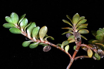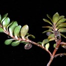 bronze green plants forming sprawling, diffuse patches and isolated tufts in open (sparsely vegetated) sodden ground. Stems up to 50 mm tall, leaves fleshy, spreading, 1.9–4.8 × 1.4–2.2 mm, obovate, with thickened margins and often minutely petiolate. Flowers white, tubular.