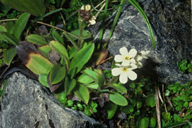 Riparian in upper montane subalpine to alpine streamsides on rocks or boulders. Akso on cliff faces, rock ledges near waterfalls and in seepages or zones of snow-melt within screes