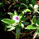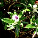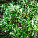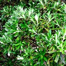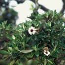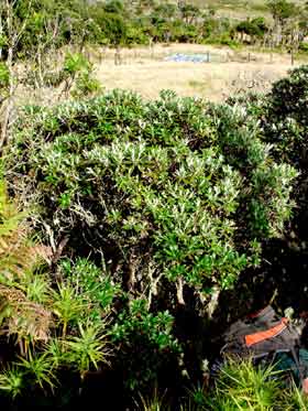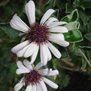 Flat-topped small tree with narrow leathery saw-edged dark green leaves that are white underneath and large whiteish daisy-like heads inhabiting the Chatham Islands. Leaves 2.5-8cm long by 1.5-4cm wide, widest at middle, many even small thick teeth along edge. Flowers 3-4.5cm wide, petals white, centre purple.