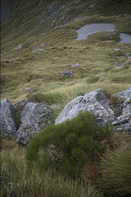 Small bushy shrub bearing many erect long very narrow wrinkled leaves that have a tightly inrolled margin inhabiting subalpine Fiordland. Leaves 5-10cm long by 2-5mm wide. Flowers small, white with yellow centre, hidden among leaves. Seeds fluffy.