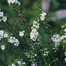 Bushy woody shrub with small hard leaves 7-15mm long by 2-5mm wide inhabiting upland Coromandel and Great Barrier Island. Leaves distinctly widest at middle, with three darker green lines on underside, with a small pale knob at tip. Flowers white, solitary in the base of leaves but many per twig.