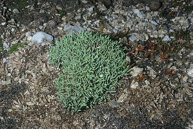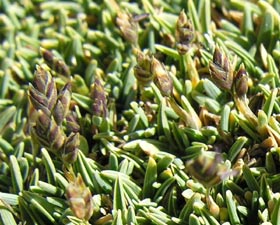 Small, dull grey-green to green, much-branched, very densely packed perennial, rooting from short prostrate branches and forming compact, rigid cushions to 100 × 25 mm high, slightly overtopped by filiform flowering culms with few spikelets; branching intravaginal, new shoots with densely imbricating leaves; leaf-blades persistent. Leaf-sheath much wider than leaf-blade, pale greyish brown, membranous, glabrous, shining, ± indistinctly ribbed. Ligule 0.5-1.0 mm, apically glabrous, entire, narrowed centrally to a short point, underside sparsely to densely minutely pubescent. Leaf-blade 3-7 × 1-2 mm, stiff, inrolled, underside glabrous, ribs prominent, upper surface strongly ribbed, ribs whitish with fine minute hairs or prickle-teeth; midrib scabrid near very curved, subobtuse or occasionally acute tip. Culm 15-25 mm, internodes mainly smooth with a few minute prickle-teeth above. Panicle 5-10 mm, contracted, racemose, with 1-3 spikelets; branches and pedicels glabrous. Spikelets 4.5-5.5 mm, 2-5-flowered, light green to purplish. Glumes equal, 2.5-3.5 mm, 3-nerved, ovate-elliptic, subobtuse, smooth or rarely with a few prickle-teeth on midnerve near tip; margins entire. Lemma 3.0-3.5 mm, 5-nerved, ovate, obtuse, lower ½ with fine, often crinkled hairs on nerves and sparse somewhat shorter hairs on internerves, upper ½ sparsely scabrid on midnerve and near wide membranous margin; midnerve occasionally minutely excurrent. Palea 2.5-3.0 mm, keels ciliate, interkeel with sparse minute hairs. Callus with few long hairs. Rachilla 0.5 mm, sparsely ciliate; prolongation twice as long. Lodicules 0.4-0.6 mm. Anthers 1.2-1.6 mm. Seeds c.1.5-2.0 × 0.5 mm.