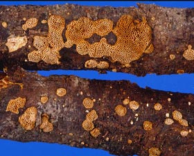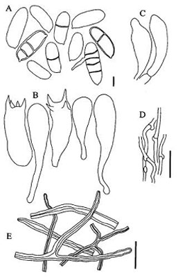 Basidiocarps are annual, resupinate, adnate, comprising small (to 0.5 cm diameter) cushion-shaped fruit bodies which may coalesce, then up to 5.5 x 2 cm, up to 2 mm thick. The pores are cream to fawn or yellow-brown, angular, 1–2 per mm, with the tubes broad and up to 1 mm deep. The context is up to 0.5 mm thick, cream to pale yellow-brown. The basidia are clavate, mostly with a long tapering base, clamped at base, 4-sterigmate, 30–53 x 5.5–13 µm. The basidiospores are broadly cylindrical, straight or mostly weakly curved (sausage-shaped), with a distinct apiculus. They are hyaline, thin-walled, 0(–4)-septate, 0-septate 12.5–21.5(–23.5) x 5.5–7(–9) µm; 1-4-septate 15.5–21.5 x 6.5–8 µm. Causing a white wood rot.