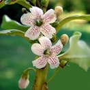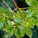 Spreading tree bearing glossy leathery oval leaves with small teeth on the edge inhabiting the Chatham Islands. New growth very glossy, green. Flowers white with purple spots, at base of leaves.