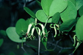 Green shrub growing on other plants known from one locality in pohutukawa forest in the Bay of Islands. No plants currently known in New Zealand. Leaves in pairs, rounded oval, 25-70mm long. Flowers tubular, drooping, pale green on outside, dark red on inside. Fruit 7-11mm long, pear-shaped.