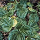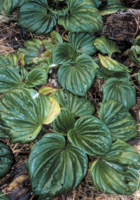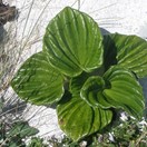 Robust, perennial herb, forming patches up to 1 m tall by 1.0–1.5 m diameter. Root stock stout, cylindric, rather fleshy, where emergent covered in numerous leaf scars, becoming woody with age. Petioles 0.1–0.5 m long, grooved above, channelled below. Lamina of basal leaves up to 0.4 m across, dark green to yellow-green, broadly ovate-cordate to reniform, thick, fleshy to coriaceous; upper surface glossy, glabrous; lower surface paler, minutely and evenly covered in retrorse hairs; margins entire; veins prominent, indented above, elevated below. Inflorescences lateral corymbose cymes, somewhat woody at base, with stem leaves; lower stem leaves similar to basal leaves, upper stem leaves smaller, oblong to broadly lanceolate or elliptic. Cymes 100–200 mm diameter, pedicels 10–15 mm long. Calyx lobes 5, 1.8–4.5 × 2.0–2.5 mm, broadly elliptic, covered in appressed hairs, apex obtuse, margin entire. Corolla 12–15 mm diameter, dark blue to pale blue, often flushing purple with age, occasionally white; lobes 5, 4.0–4.5 × 5.0–6.0 mm, orbicular, rounded, spreading, overlapping, apex obtuse; tube 2 mm long, throat partially occluded by 5 fleshy protuberances. Filaments c. 0.5 mm long, inserted near throat; anther included, 1.0–1.2 mm long. Ovary 4-lobed, style 0.7–1.0 mm long, stigma capitate. Fruit a nutlet, 10–15 mm diameter, brown to black, winged around margin; seed obovate, 7.5–9.0 mm long, testa black-brown.