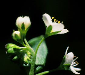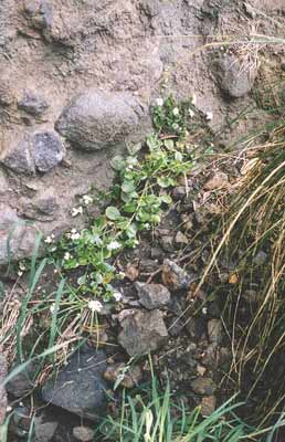 Stout, robust to weakly erect plants up to 250 x 250 mm. Rosettes and laterals often greatly elongated. Petiole long and narrowly winged up to 30 x 5 mm, margins fringed by long spreading hairs. Rosette-leaves variable in size and shape, up to 40 x 35 mm, bright lettuce green, green, dark-green or bronze-green, sometimes suffused with red, orbicular to broadly elliptic or elliptic, apex rounded or retuse, usually finely apiculate, base obtuse to broadly attenuate; both leaf surfaces sparsely covered in widely spaced, short, straight, stiff, more or less appressed hairs. Lateral branches few- to many, 60-500 mm long, weakly erect to flaccid, very leafy, often rooting on contact with soil; internode length variable, usually approximating leaf length. Stem leaves broadly elliptic, elliptic to ovate, at first petiolate, becoming sessile toward lateral apex, hairs as for rosette-leaves, though more closely appressed near lamina margin. Inflorescence cymose, cymes simple, without bracts, many-flowered, 40-160 mm, internodes 4-8 mm. Pedicels 4-10 mm long. Calyx 4-6 mm, cut almost to base, lobes 3-5 mm long, narrowly lanceolate, subacute to acute, spreading at fruiting. Flowers white. Corolla 9-16 mm diameter, lobes 6-8 mm, broad-oblong to oblong, obtuse or rounded, spreading, corolla tube 1.5-2 x 2.5-4 mm, wider than long, funnelform, scales placed well below calyx lobe apices, stamens 1.2-2(-3) mm long, style 1.5-3.5 mm, stigma capitate. Nutlets 1.5-1.9 x 1.2-1.4 mm, black, glossy, ovate to broadly ovate.