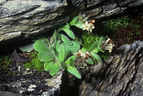 Small, rossette forming, perennial herb. Leaves broadly obovate-spathulate 2-4 × 0.7-1.5 cm, tip rounded with a small emergent spine (mucronate), all parts but especially the leaf undersides very hairy. Hairs long, tapering, appressed, on undersides shorter. Lateral branches few, ascending up to 10 cm long. Upper stem leaves narrow-elliptic and stalkless, 1-2 × 0.3-1 cm, tip broadly acuminate, hairs numerous, long and silky, appressed. Inflorescences 2 cm long, simple or branched, terminal. Flowers without subtending bracts. Calyx 5-7(-8) mm, lobes > half length, obtuse, copiously covered in appressed often hooked hairs. Corolla white 5-7 mm diameter, tube 4-6 mm, funnel-like, lobes flat, rounded, 1.5-2.5 × 1.5-2.5 mm diameter, stamens with very short filaments, fixed immediately below corolla scales. Anthers 1.5 mm, projecting above rather large corolla scales.