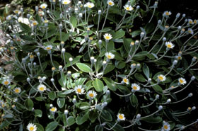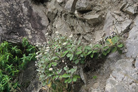 Small and slender spreading shrub, less than 1m tall. Leaves diamond-shaped or blunt-ended 6.5-10cm long, 2.5-4cm wide, with a thin layer of felted hair on the back. Flower heads white, max. 3.5cm diameter. Flower stalks slender, sometimes leafy, about 10cm long.