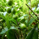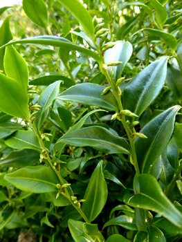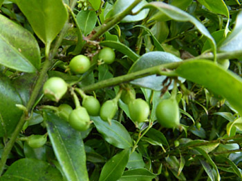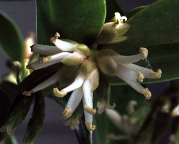 Evergreen shrub, 1-4 m tall, erect, densely branched. Leaf lanceolate 20-30 mm × 7-12 mm, somewhat leathery, bright green above, lighter green below; tip acuminate. Monoecious with flowers in short racemes; flowers white, fragrant. Fruit fleshy, 7-8 mm diameter, scarlet, terminating with 2-3 persistent styles