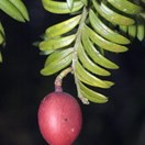 Stout tree up to 25 m tall. Trunk 1-1.5 m diam., in adults clear of branches for 2/3 of length. Bark thick, grey. Falling in thick, sinuous flakes. Leaves feathery, dark green, green to bronze-green, distichous, erect, narrow-linear, acute, falcate to subfalcate, acute to subacute, mid vein distinct, margins recurved, juveniles up to 30 mm long, those of adults 15-25 x 2-3 mm. Male cones (strobili) solitary, axillary, 5-15 mm long. Ovules solitary (rarely paired), on short branchlets 10 or less mm. long. Fruit a broadly oblong to sub--spherical red, pink-red fleshy drupe up to 20 mm long - fleshy, oily, smelling and tasting strongly of terpenes. Stone elliptic to broadly elliptic 11-17 mm long, dark brown to black-brown.