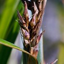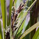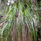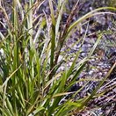Harsh, leafy tufted perennial sedge 200-700 mm tall. Rootstock, stout, lignaceous. Leaves numerous, >> culms, 200-620 x 4-8 mm, green to yellow-green (rarely dark green), flat, curving, scabrid on the abaxial, tapering to a filiform apex, this usually curled when dry; margins scabrid, strongly revolute in the long persistent dry old leaves; sheath rather short compared to lamina, not demarcated from lamina by any transverse line but merely becoming broader, cream, with membranous margins. Panicle erect, rigid, 60-300 mm long, with short, more or less distant branchlets subtended by rigid, scabrid, leaf-like bracts. Spikelets 6.5-10.0 mm long, narrow-lanceolate, shortly stalked. Glumes coriaceous, minutely puberulous, keel and margins finely scabrid; 4 outer glumes smaller, increasing in size, usually acuminate, 2 upper glumes much longer, acute, rigid; a seventh minute membranous glume subtending the uppermost sterile flower. Nut 2.5-3.0 x 1.5 mm, elliptic-oblong, lustrous red-brown to black, with 3 longitudinal ribs, surmounted by a thickened, corky style-base which is very distinct in the immature fruit; ripe fruit retained on plant for a time by being entangled in the slightly elongated staminal filaments.