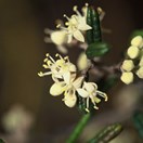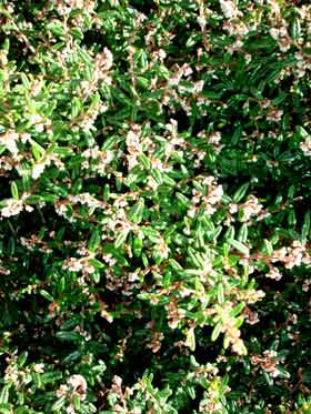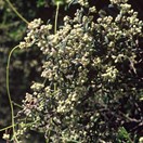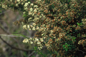Locally very common small shrub to 1.5m tall with hairy twigs bearing masses of small narrow wrinkled leaves and clusters of white flowers. Leaves 10-30mm long by 3-10mm wide, margins inrolled, underside fuzzy. Fruit dry, small.