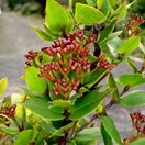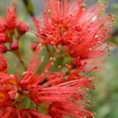 Much branched shrub or small tree. Trunks 1 or more. Branches erect. Leaves almost clasping stems, dark green to yellow green above, paler beneath, thick, leathery, pointed, surfaces often blistered and blemished red. Flowers crimson, fluffy produced directly from branches, and often hidden by vegetative growth.